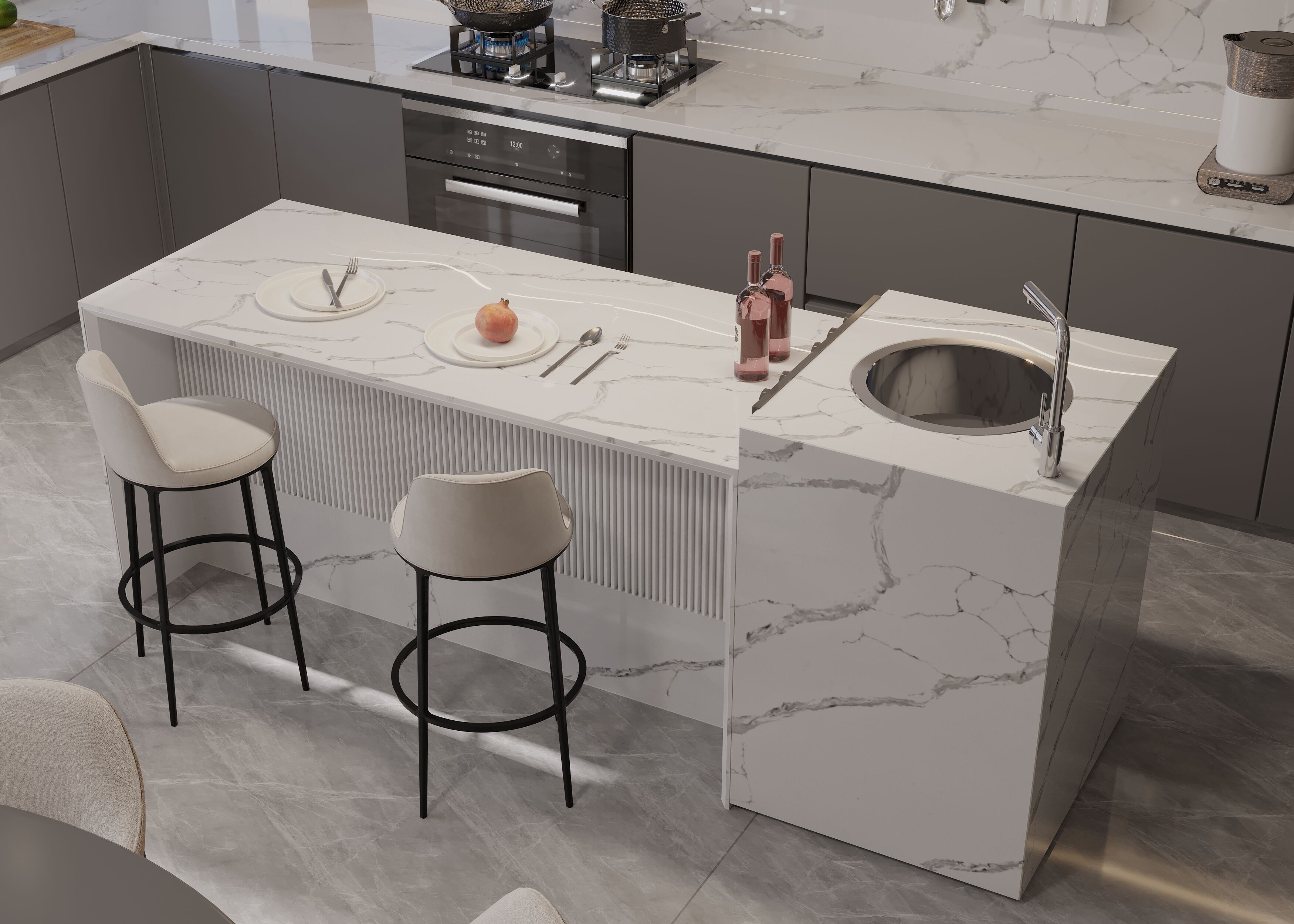 صفحه کوارتز سفید کارارا یک سنگ مهندسی شده درجهیک است که برای پیشخوان هتلها، آشپزخانه آپارتمانها، سینک وانیتی و پروژههای تجاری بزرگ طراحی شده است.