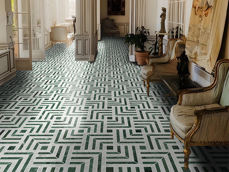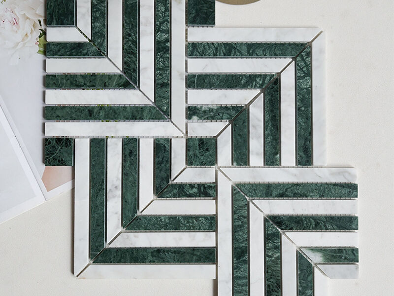 Green and White Marble Mosaic Tile showcases a striking geometric pattern formed by alternating strips of deep green marble and crisp white marble, precision-cut and assembled into a layered, directional layout. The contrast between the rich emerald tones and the clean white base creates strong visual rhythm and architectural depth, making this mosaic especially suitable for feature walls, bathroom backsplashes, shower areas, and decorative interior wall cladding. Crafted from natural marble, each sheet presents unique veining and color variation, while the polished surface enhances light reflection and highlights the sharp lines of the design. This type of green and white marble mosaic tile is widely specified in high-end residential interiors, boutique hotels, and luxury commercial spaces where refined stone details are required.