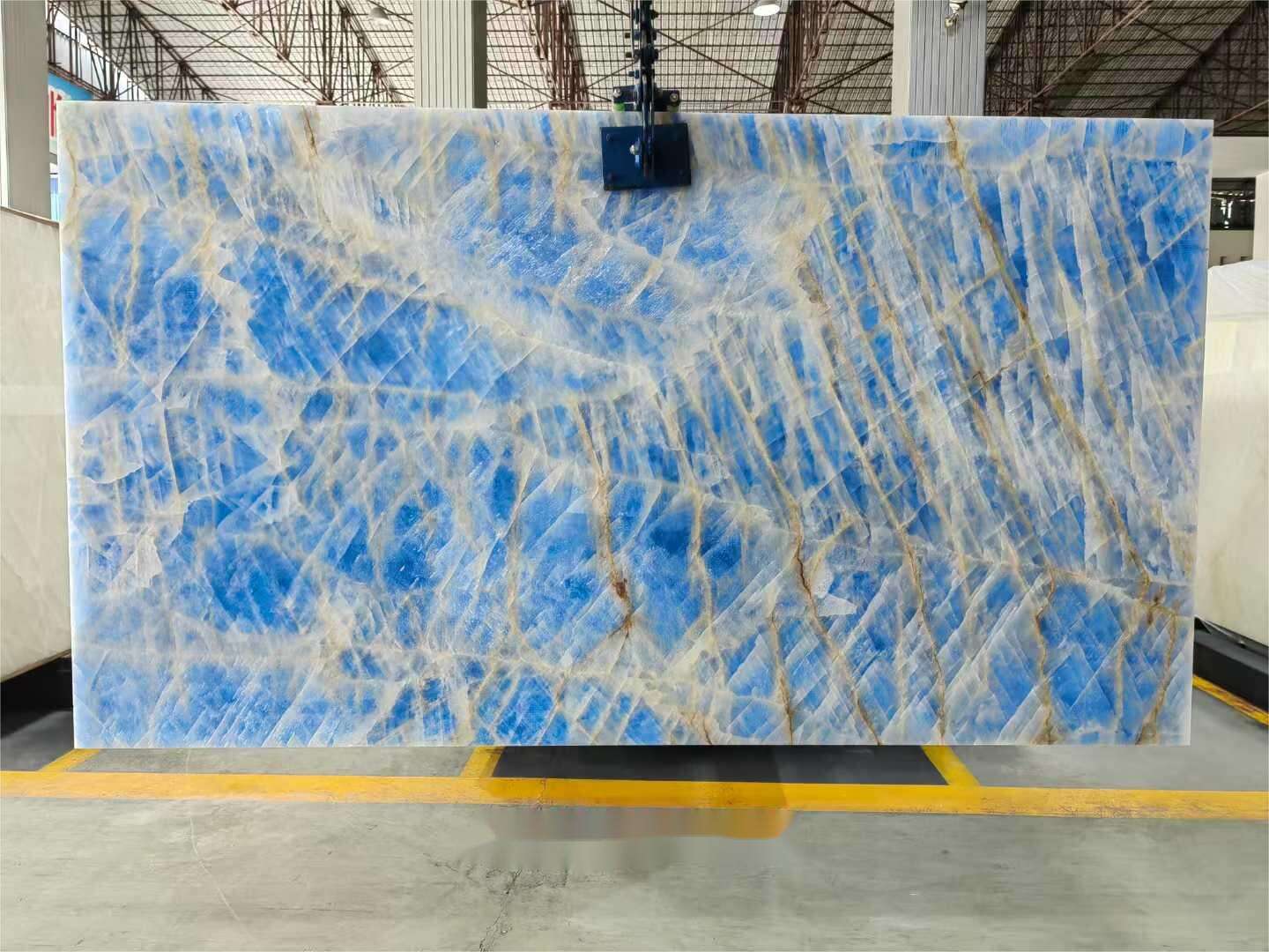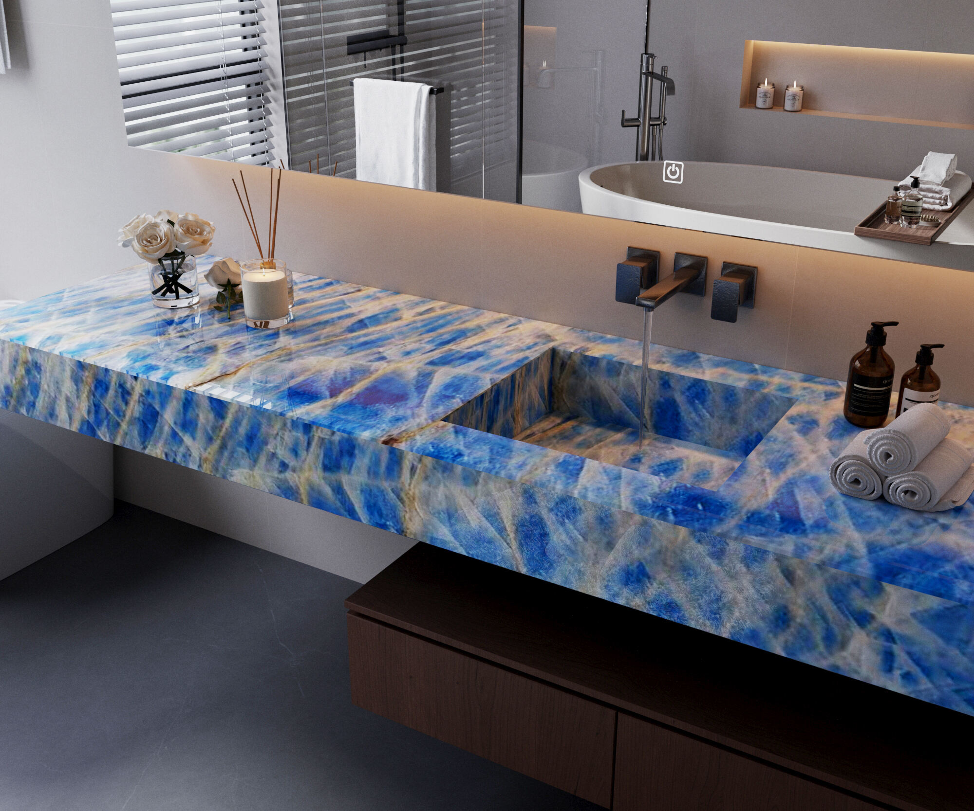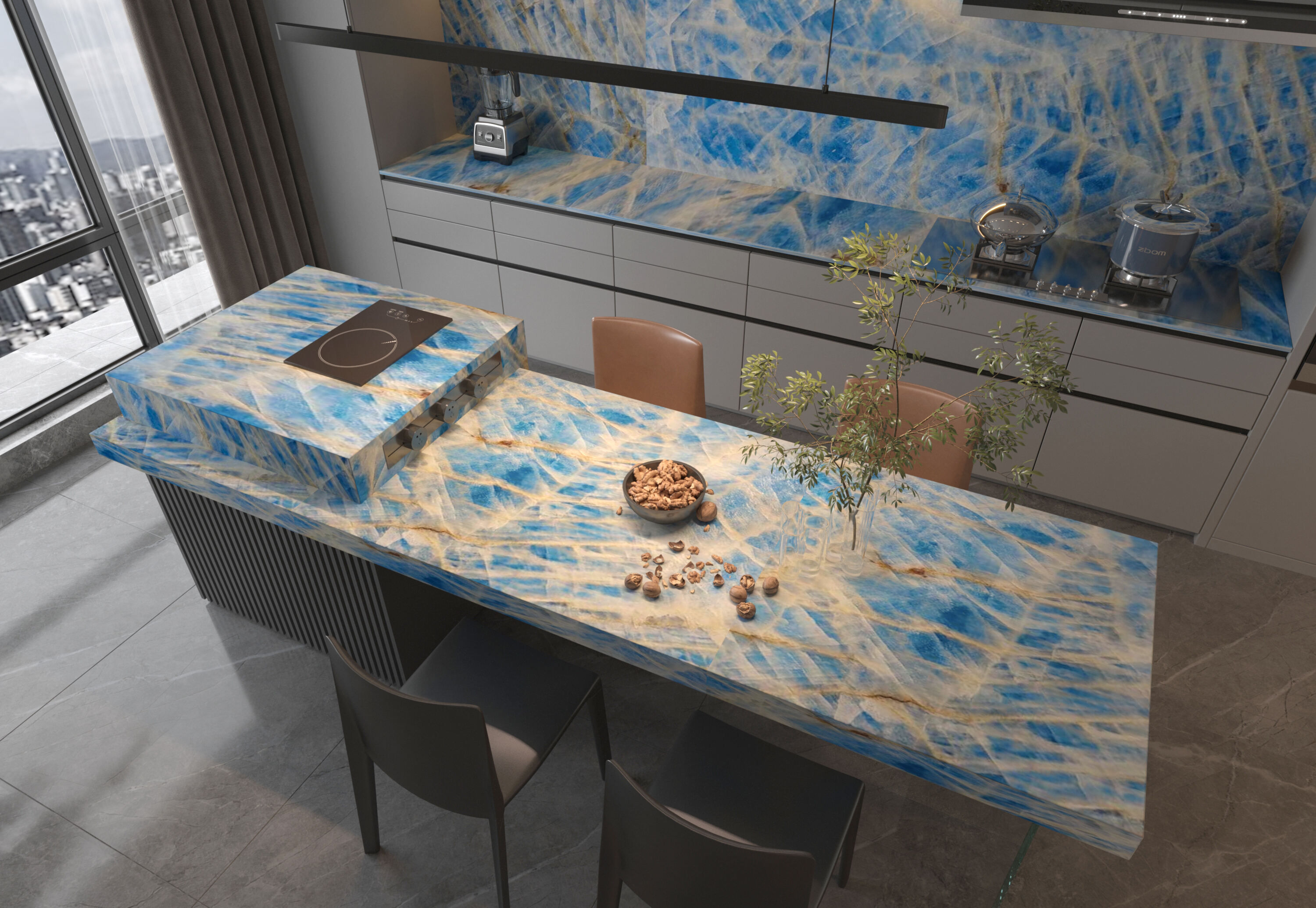 아이스 크리스탈로 블루 쿼츠라이트는 백라이트 벽면, 카운터탑, 주방 아일랜드, 욕실 세면대, 바닥 타일 및 상업용 포인트 벽면 등에 이상적이며, 어떤 공간에도 고급스러운 분위기를 더해줍니다.