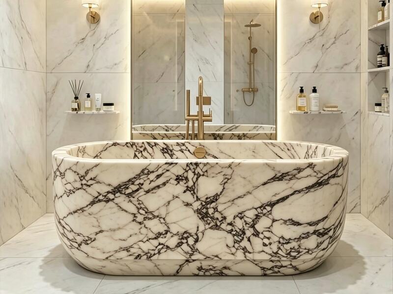 De Calacatta Viola marmeren badkuip is vervaardigd uit eersteklas natuurlijk Calacatta Viola-marmer, beroemd om zijn opvallende witte ondergrond en dramatische paarse aders, waardoor een krachtige maar tegelijkertijd elegante luxeuitstraling ontstaat. Elke badkuip toont unieke, natuurlijke patronen en wordt daarmee een sculpturale centrale plek in luxe badkamers, boetiekhotels, spasuites en hoogwaardige residentiële interieurs. Deze vrijstaande badkuip combineert tijdloze, Italiaans geïnspireerde esthetiek met de duurzaamheid van natuurlijk marmer en biedt zowel artistieke schoonheid als functionele verfijning voor exclusieve badruimtes.