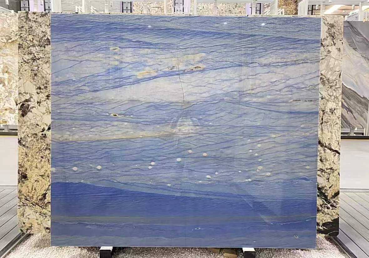 Egzotyczny i Luksusowy Wygląd: Żywa niebieska podstawa oraz falujące żyłkowanie nadają mu niezrównane egzotyczne uroki, co czyni go idealnym wyborem do ekskluzywnych wnętrz wymagających wyrafinowania. Niezależnie od tego, czy zestawi się go z nowoczesnym, minimalistycznym wystrojem, czy z klasycznym, przepysznie stylizowanym wnętrzem, natychmiast podnosi poziom przestrzeni, zamieniając zwyczajne powierzchnie w arcydzieła wyraziste stylu i wyrafinowanego gustu.
