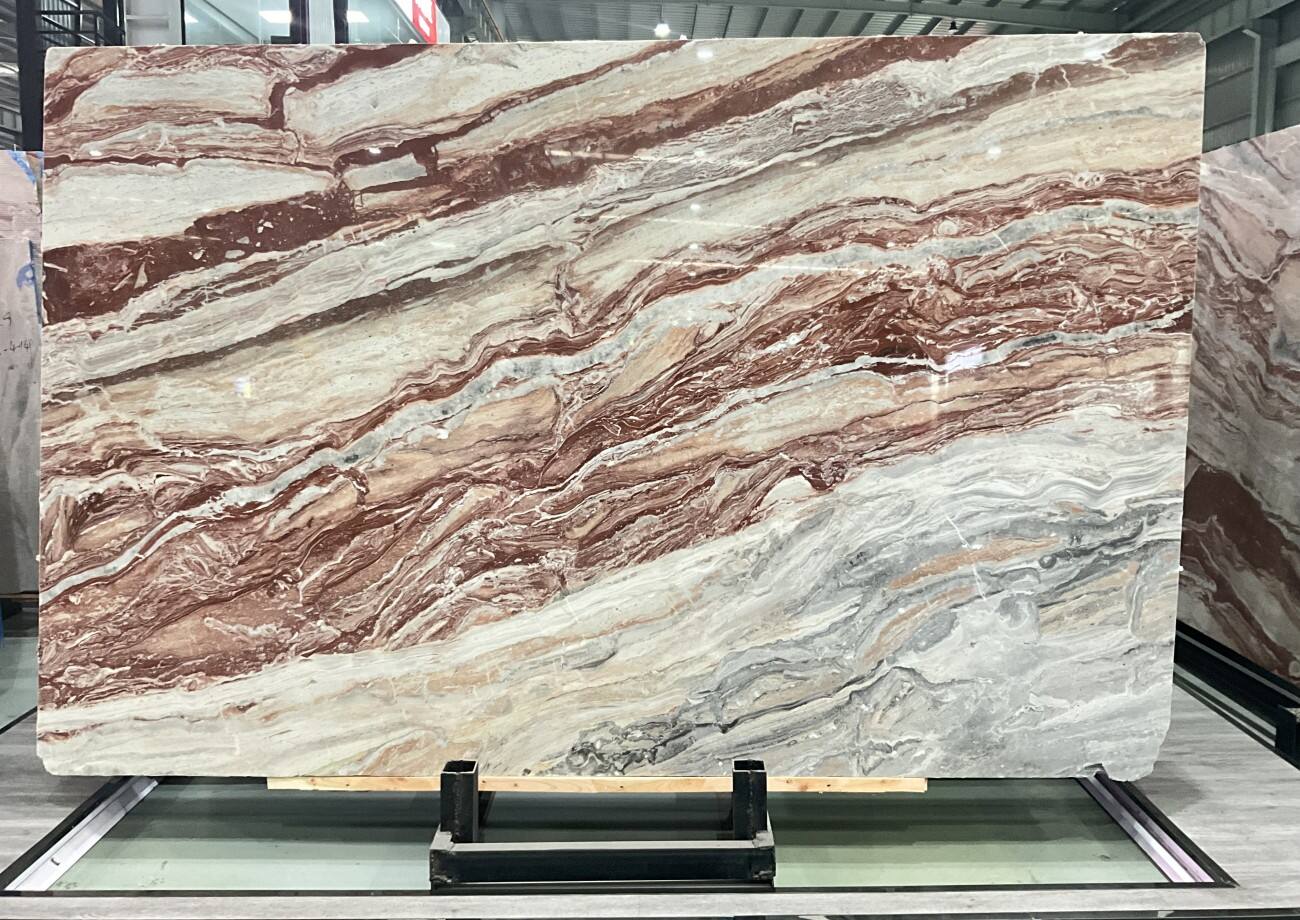 Śmiały i unikalny wygląd: głęboka czerwona podstawa to siła napędowa projektu – od razu przyciąga wzrok i stanowi naturalny punkt centralny w każdym luksusowym wnętrzu. W minimalistycznych przestrzeniach dodaje śmiałego akcentu kolorystycznego, który łamie neutralne kolory bez powodowania konfliktów; w wnętrzach tradycyjnych komponuje się z bogatą drewnianą inkrustacją lub gildowanymi elementami, podkreślając klasyczną elegancję. Biało-złote żyłkowanie nadaje subtelny interesujący efekt wizualny, zapewniając, że kamień nie wygląda jednowymiarowo – przy każdym spojrzeniu odkrywa nowe detale swojego wzoru.