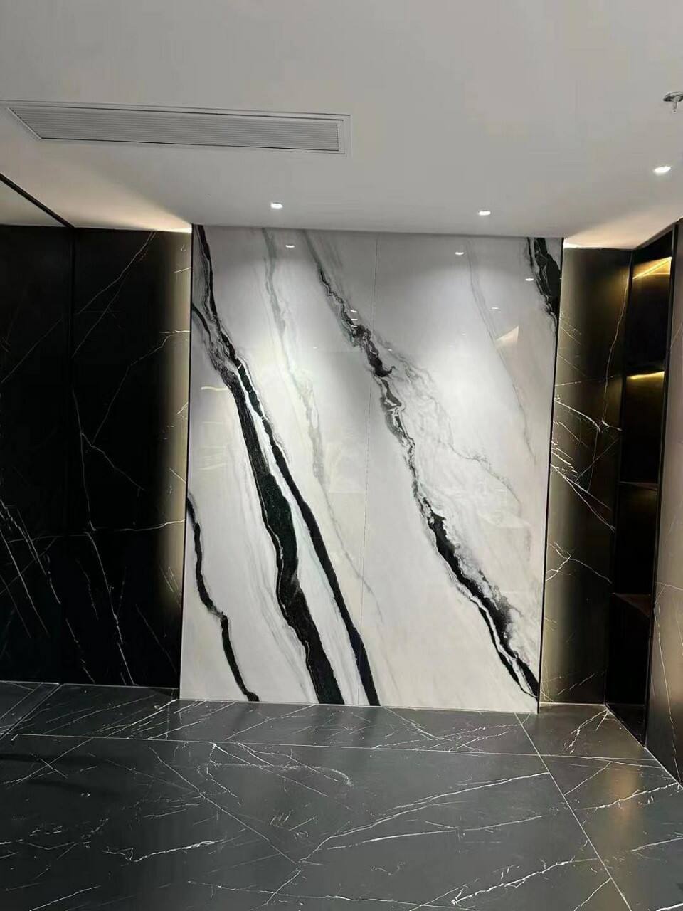 การบุผนังและพื้น: เมื่อใช้เป็นวัสดุบุผนัง สามารถเปลี่ยนผนังธรรมดาให้กลายเป็นจุดเด่นที่น่าสนใจ ตัวอย่างเช่น ผนังตัดแต่งพิเศษในห้องนั่งเล่นที่ใช้แผ่นหินจับคู่แบบสมมาตร (bookmatched) จะกลายเป็นจุดที่ชวนให้พูดถึง ในขณะที่การใช้บุผนังในห้องสวีทโรงแรมก็ให้ความรู้สึกหรูหราโดยไม่ทำให้พื้นที่ดูแน่นเกินไป เมื่อใช้เป็นพื้น แผ่นขนาดใหญ่ (3200×1600 มม.) ช่วยสร้างลุคที่ทันสมัยไร้รอยต่อ และทำให้พื้นที่ขนาดเล็กดูกว้างขึ้น ความต้านทานต่อรอยขีดข่วนทำให้ทนต่อการเดินเหินจากรองเท้า สัตว์เลี้ยง หรือเฟอร์นิเจอร์ จึงเหมาะสำหรับใช้งานในโถงทางเดิน ทางเข้าอาคาร หรือล็อบบี้เชิงพาณิชย์