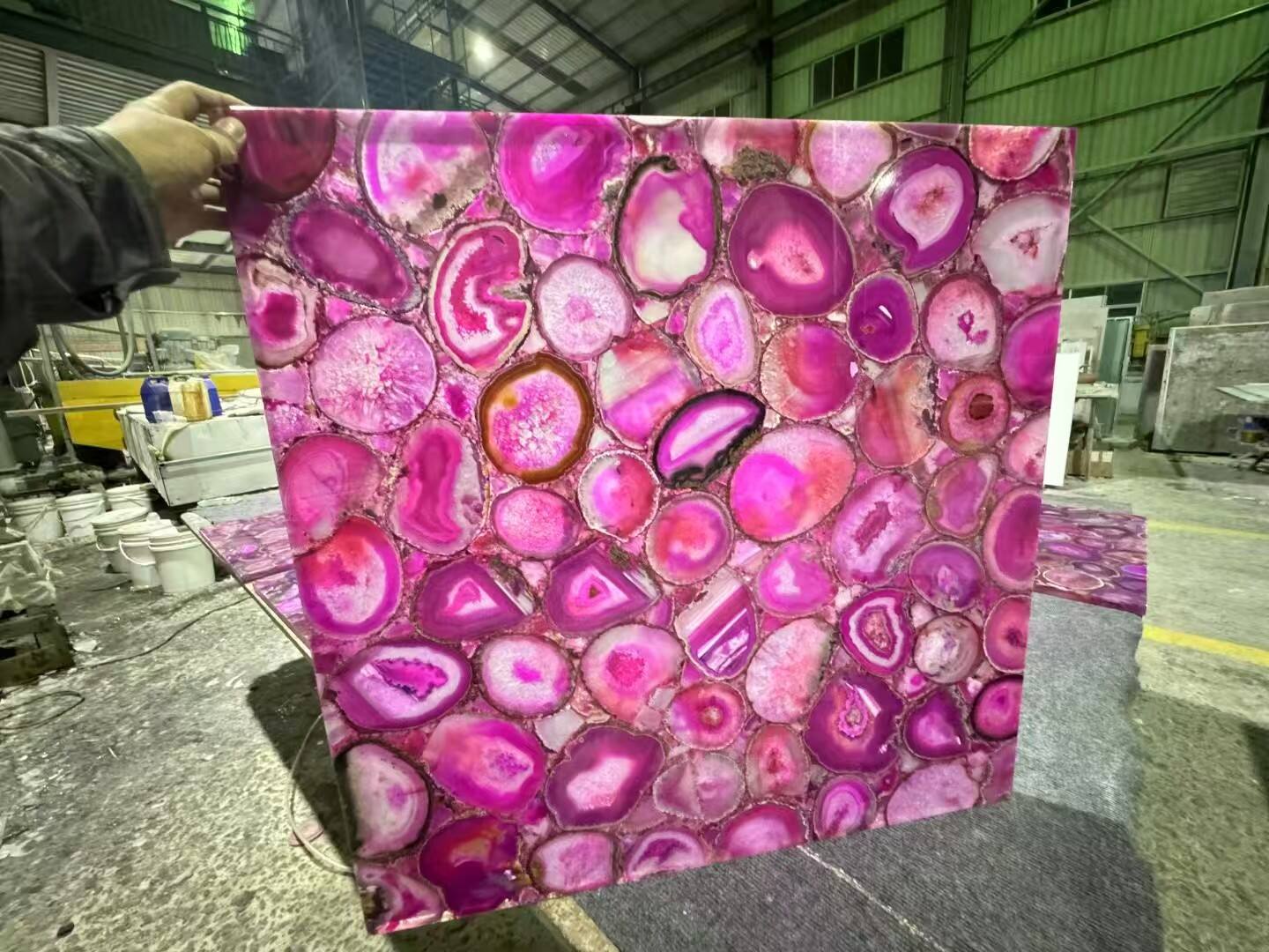 Професійне виготовлення: Наша команда спеціалізується на передових технологіях, адаптованих до унікальних властивостей рожевого агату: книжкове зіставлення (поєднання плит для створення дзеркального ефекту смугування для акцентних стін), інтеграція підсвічування (точне вирізання каналів для світлодіодів без пошкодження каменю), складання мозаїки (створення складних візерунків із дрібних шматків агату) та різання водяним струменем (виготовлення нестандартних форм для стільниць або меблів). Кожен процес проходить перевірку якості, щоб зберегти красу та цілісність каменю.